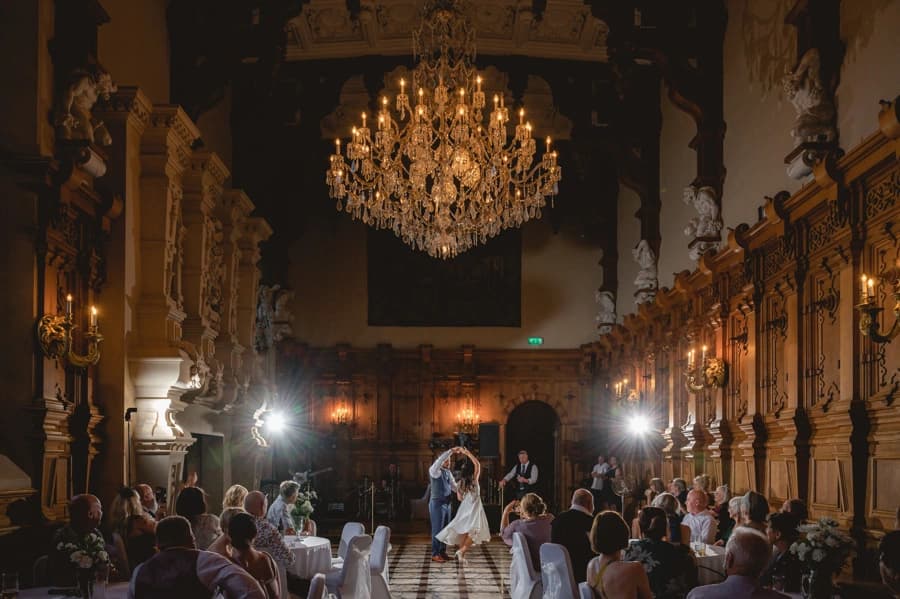 With its ornate oak panelling, magnificent crystal chandelier and Italian marble flooring, the Great Hall is a stunning space for up to 350 guests. The Great Hall conveniently connects to the magnificent State Dining Room bar area through a secret passageway – always a talking point for guests. Above the ornate stone doorway is the Minstrel Gallery, which is an ideal vantage point for group photos.